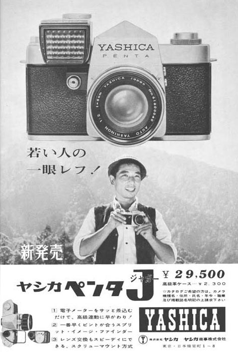 Japan's first SLR was the Asahiflex in 1952. This still featured a waste level viewfinder whereas the Germans were already introducing pentaprisms (the 1949 Contax S was the first). The first Japanese SLR with eye level finder was the 1955 Pentaflex with porroprism (using mirrors instead of a pentaprism, later common on budget SLRs and DSLRs) made by niche maker Tokiwa Seiki and this was followed four months later by the 1955 Orion Camera Co. made Miranda equipped with Japan's first pentaprism viewfinder. Then in 1957 came the Asahi Pentax, still with manual preset aperture, which established the layout of the modern SLR including lever wind (first introduced by Exakta in 1934, albeit on the left, and popularised by the Leica M3 rangefinder), Tokiwa Seiki's new Firstflex and the Topcon R. The Topcon used Exakta's external shutter pressure activated automatic aperture. It was followed by the 1958 Zunow debuting the World's first internally linked fully automatic aperture diaphragm. The internally linked “automatic” (advertised as that but not fully auto, similar operation to the 1953 Praktina FX and 1956 Contax F) Minolta SR-2 arrived in late 1958 and 1959 saw the release of the Petri Penta, Nikon F and Cannonflex, the first a basic camera with a manually set preset lens and the last two with fully automatic apertures. The Konica F, the first SLR with a 1/2,000 shutter speed and first Japanese SLR with cross coupled selenium exposure meter, arrived in early 1960, probably near the Pentamatic release. So most of the main competition arrived first but with the benefit of hindsight into what consumers wanted, there was opportunity too for Yashica to get the price and features right.