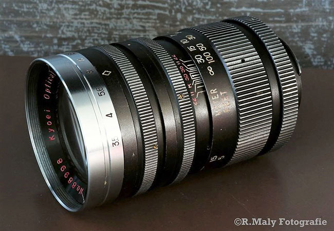 The first version is somewhat reminiscent of the LTM appearance-wise and has the distance and DoF scales near the lens mount (i.e., below the focusing ring). The catalogue version is as described above with the different appearance and proportions but with the distance and DoF scales in the middle (i.e., above the focusing ring). Contributor Chris Whelan has found a single example of a third version of the Kyoei Acall on Flickr (full size image) which is identical in every way to the “135mm” in the middle of the above Japanese image except the mount (Exakta), the colour of the graphics (but not the style or detail) and the very edges of the ribbing which are polished alloy in an unusual very fine zebra effect (perhaps to complement the coarser zebra look on some Exakta lenses from 1956 to the early 1960s). Chris Whelan's Super Yashinon-R version of the lens is the first image below followed by René Maly's Kyoei Acall: