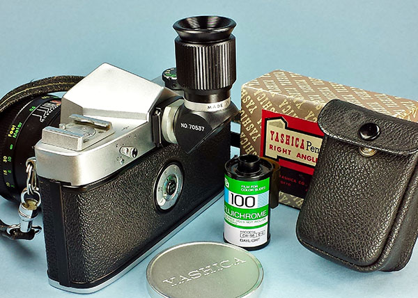 The available accessories noted in user manuals and brochures (some depicted above) include Exakta bayonet and Praktica screw (M42) lens mount adaptors, extension tubes, bellows, microscope adaptor, right-angle finder, lens hoods, filters, copy stand and clip on exposure meter for the Pentamatic S (modified version without 1/1000 shutter speed available for the Penta J). I have recorded examples of all for sale on eBay (many of them still boxed so easy to identify for Pentamatic). Also usually listed is an oscilloscope adapter which, not surprisingly, I am yet to see outside of Yashica documentation and in a Pentamatic S system brochure, a spotting scope adapter which I have also not seen. Surprisingly, the only reference to flash as a Yashica accessory is also in the Pentamatic S brochure; “A variety of standard and special Yashica flash units, bulb and electronic, are available ...”. Below is a Pentamatic S complete with original neck strap and accessory exposure meter and 54 mm slip-on lens hood: