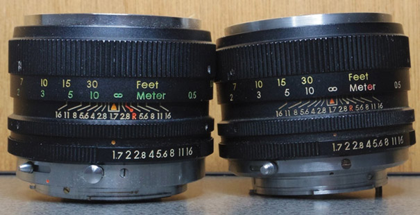 The second is the short lived f/1.7 5.8 cm lens released with the Pentamatic II in about September 1960 with the last example of the camera being made in January 1961 (last that I have found). Note, the font for “Japan” is different to the above lenses, more refined and closer to the “standard” Yashica style but still with the other variations noted. This lens, differed from the Pentamatic and Pentamatic S f/1.8 5.5 cm version by featuring a stop-down depth of field (DoF) preview button, 10 bladed aperture diaphragm versus 6, or 9 on early examples, and with the aperture ring spinning in the Zunow SLR-like opposite direction (to the right to open the aperture when holding the camera). That's a big thing - until now, on all Yashica's 35 mm lenses, from the Yashica 35, the YE and YF to the Pentamatic and all their accessory lenses to date, both distance and aperture scales spin to the left for longer distances and wider apertures respectively (the focus ring on three later black nose accessory lenses, the second 3.5 cm and the two 13.5 cm lenses, spin to the right). Pentamatic II f/1.7 lens on left, Pentamatic S f/1.8 lens (same as the Pentamatic type) on right: