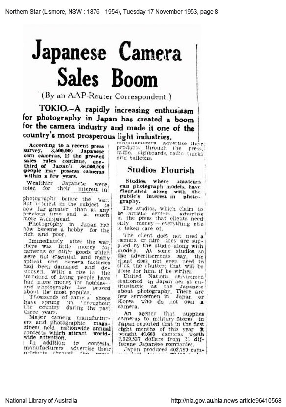 The second World War left much of the Japanese photographic industry destroyed or damaged. However, things changed quite quickly. Whereas before the War, photography had been the past-time of the wealthy and well to do, post-War, it was adopted by the masses. By early 1952, Japan was again an independent nation but the Korean War was in full swing. A snapshot of the Japanese love of photography and the impact of United Nations service personnel (the great majority being US servicemen) is provided in an article, “Japanese Camera Sales Boom” by an unknown AAP-Reuter correspondent, which appeared in the small New South Wales country town of Lismore newspaper, The Northern Star, on 17 November 1953: