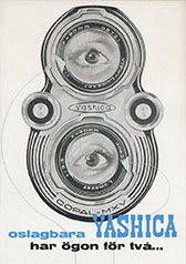 Below is a Yashica TLR brochure, printed in Sweden in 1961. Note, that the trim details of the Yashica-Mat on the cover and inside are of earlier versions.
