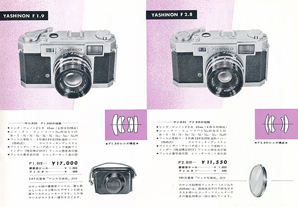 The first brochure calls the Yashica 35 “Yashica 35 F 2.8 S”, the second more circumspectly “35 F 2.8 S” with the “F 2.8” much smaller. For those that believe in a “Yashica 35 F” model, this is no help as “F 2.8” was Yashica's way of writing the aperture for any of the contemporary models. The mystery for me is that the f/1.9 lens version seemed to disappear from Japanese advertising in 1959 even though there a couple in my database from the last month of production, although admittedly, virtually nothing in the months earlier. Then there is the “S” which seemed to appear when the f/1.9 ads stopped. What does that mean?