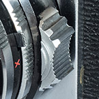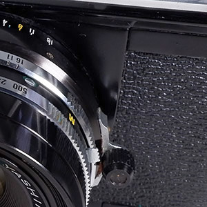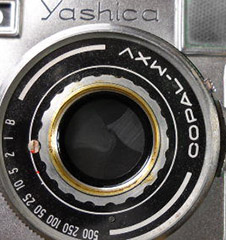 With the shutter open on Bulb, the aperture with 10 curved blades is visible which is typical of the Copal MXV and earlier shutters used on Yashica's TLRs. The SV shutters used on Yashica TLRs typically have 5 blades but I'm certain that is not a design absolute, just an optional variation offered by Copal. The two shutters, when configured the same, really are very similar, operate the same way and seem to share parts - see Lenses & Shutters.