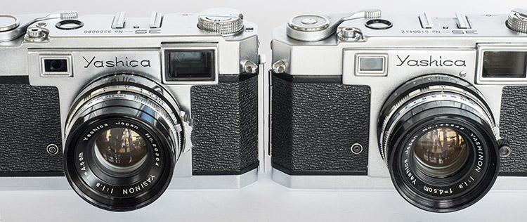 Two versions of the Yashica 35 were offered, one with an f/1.9 4.5 cm Yashinon lens and the other with an f/2.8 4.5 cm Yashinon lens. In other respects, the two models were identical. Both lenses are relatively sophisticated for the time, the f/1.9 is 6 elements in 4 groups Planar design and the f/2.8 is 5 elements in 4 groups Xenotar design (5 element version of the original Planar):