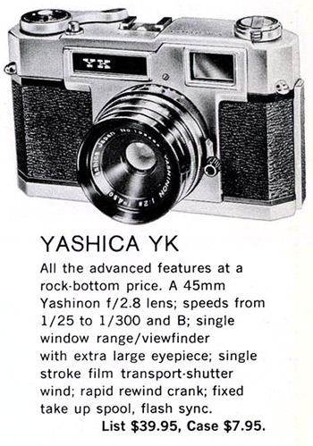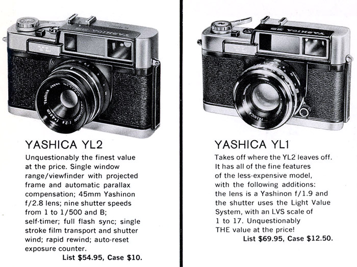 Contrary to popular folklore and even claims in Camera-wiki.org and the Yashica Guy's website, the Minister III didn't arrive in 1963 and fit between the Minister II and Minister D, it first appeared in 1966. I think that in the absence of access to other evidence, somebody early on has made an “educated” guess and got it wrong. The Camera Collectors' News of July 1987 article tells us it was released in March 1966, one month after the Electro 35. The fact that it has a selenium exposure meter still may seem strange but it was the market and price points that Yashica was aiming at. The Minister III and D, along with a couple of Lynx models and the J (in a travel kit) still appear in a 1969 Yashica USA price list. Here it is in a brochure with the Electro 35 and Lynx 5000E and Lynx14E released in 1968: