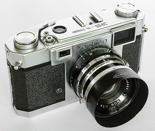 The Yashica 35 is a solidly constructed, substantial, mostly glass and metal full manual camera without exposure meter. Like several other Japanese rangefinders from the period, the handsome overall look of the camera is borrowed from the pre-War German Contax II, or from the Nikon S, take your pick. The Nikon S was a visual copy (and more) of the Contax II in any case. With lever film wind, re-wind knob with folding crank and hinged back, the Yashica 35 is already modern but still uses the sliding latch on the side for opening the back which was common in the 1950s. Very early f/1.9 version pictured with matching lens hood, below it, a relatively late example: