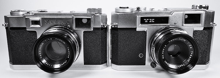 Released in October 1962, the Yashica EE offered more sophisticated selenium cell based auto aperture automation with manual speed selection, i.e. shutter priority, in a rangefinder body resembling the Lynx and Minister models, “blackface” on left and “whiteface” on right, both with f/1.9 lenses, an f/2.8 version was also available: