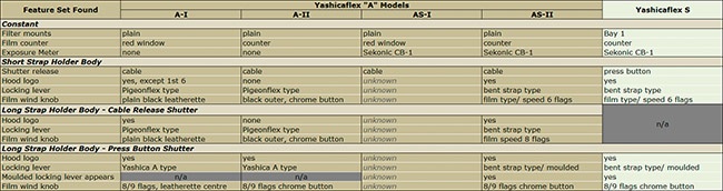 Below is a table that compares the feature sets of the four original “A” models against the “S”. The A-I and A-II are claimed to be released in October 1954 and the AS-II in November 1954. The “S”, I believe, was in 1954 as claimed but much earlier than the others. The Yashica Flex B was still in production but near its end and the Yashicaflex C didn't arrive until probably later in 1955, the A-III at a similar time and the A2 and A (new model) models later still. Trim changes that applied across the whole of the range such as spool knob design and move of flash sync to the front (low set on “A” models, high set on “S”, a convention that carried through to the later Yashica A and premium models) are not included. (Note. Whilst this table relies on details found on actual cameras, I have not yet found any confirmed red windowed AS-I examples other than reference to its existence in both the original Yashicaflex A and AS user manuals from probably late 1954 and a later combined manual - see further down.)